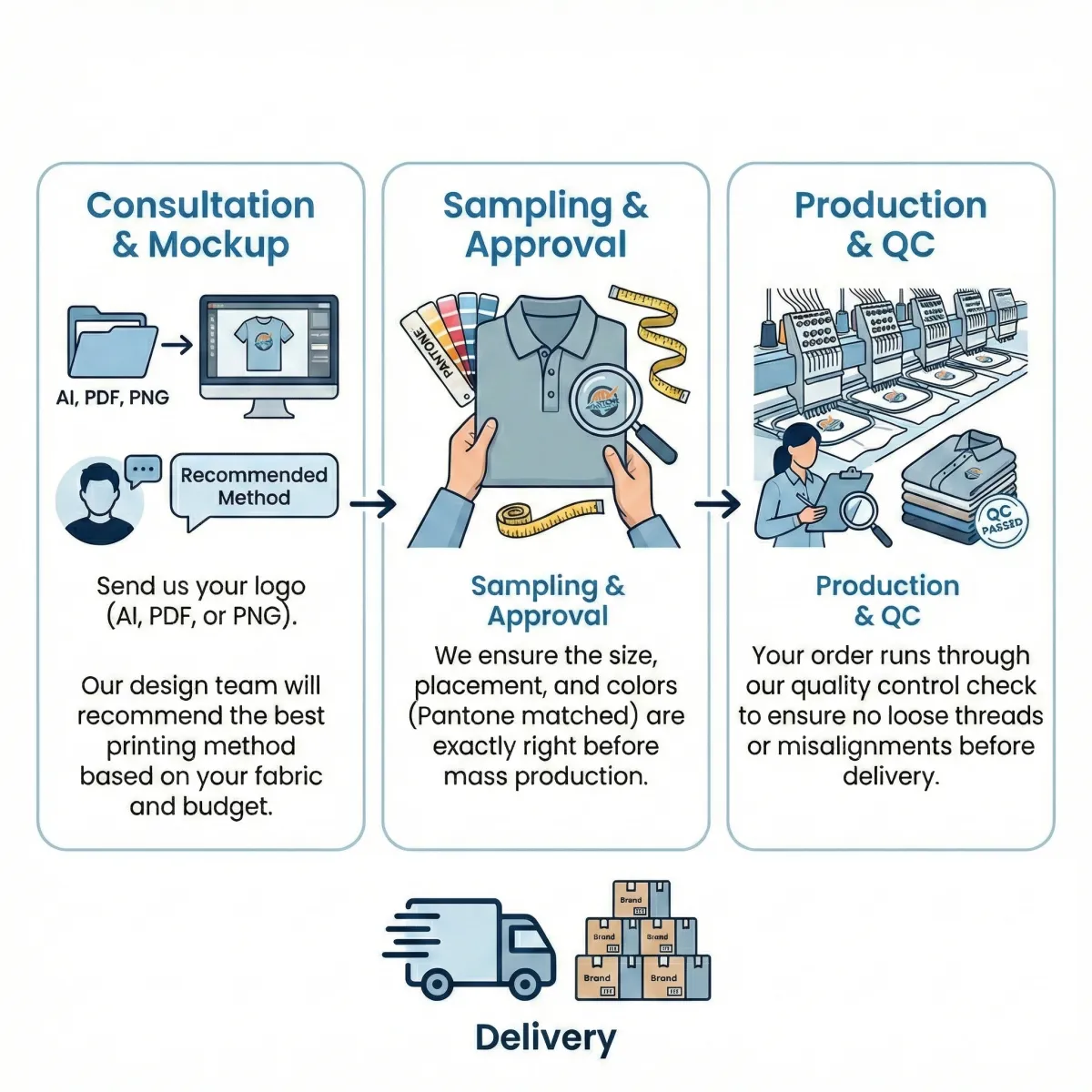 Whether you need a single executive polo or 5,000 promotional t-shirts, we guarantee crisp details, vibrant colors, and zero compromise on quality.